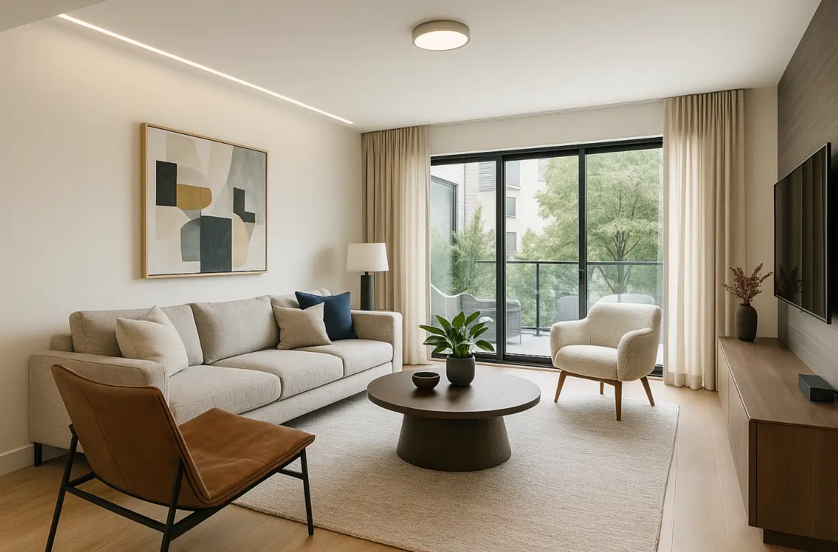 This contemporary living room showcases an open layout with stylish furnishings and smart home features.